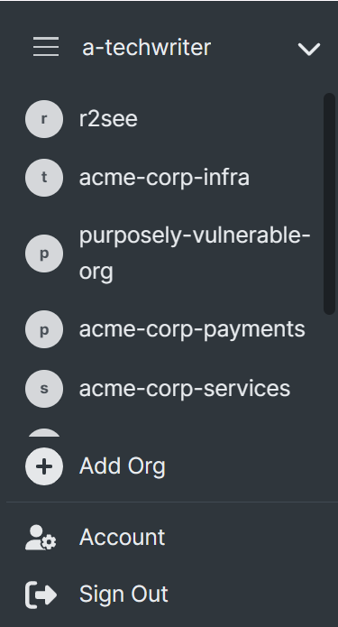 Optional: If you have created more than one Semgrep account, select the account you want to make a connection for by clicking on the Navigation bar > Your account name > The account you want to connect.